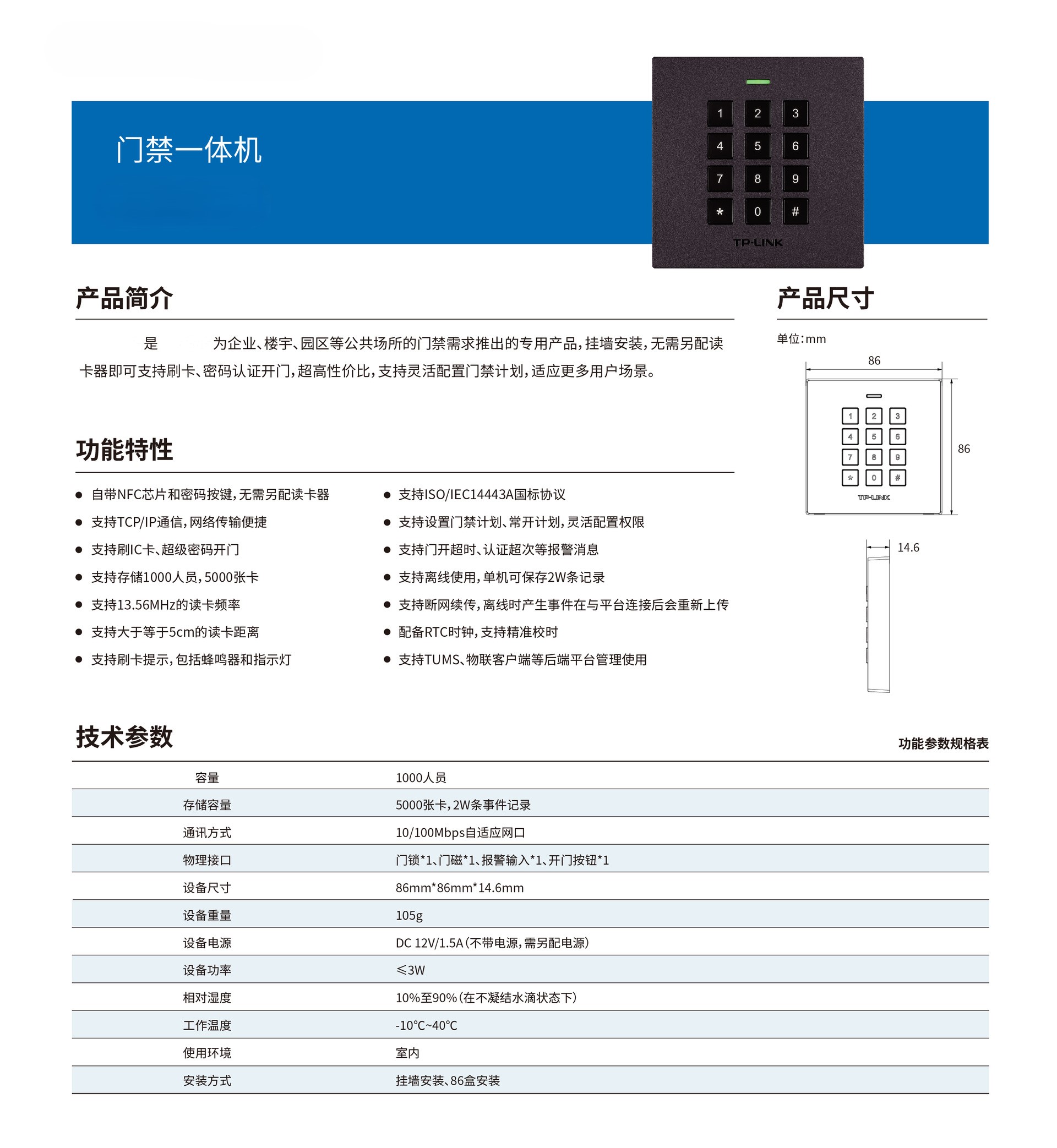 021H Access Control All-in-One Machine This product is specifically designed for access control needs in enterprises, buildings, parks, and other public places. It is wall-mounted and supports card and password authentication for access control. It allows for flexible configuration of access control plans to adapt to various user scenarios. Features: