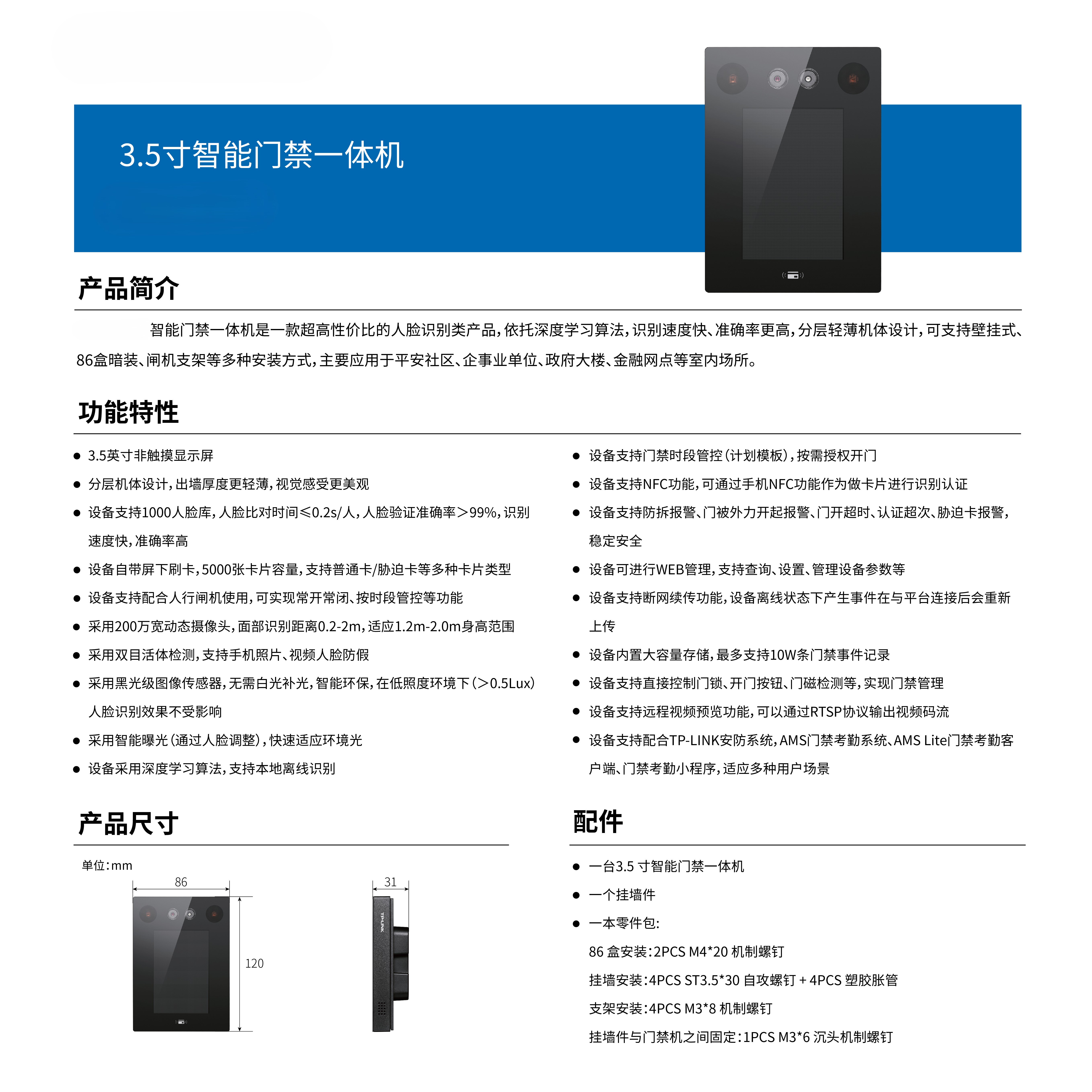 Supports multiple installation methods including surface mounting, recessed mounting in 86-type boxes, and pedestrian gate bracket installation. Utilizes a 2MP wide dynamic range camera, with a wide facial recognition distance. 0.2-2m, suitable for height ranges of 1.2m-2.0m.
